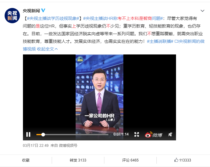 尽管大家觉得有问题的是这位HR,但事实上学历歧视现象仍不少见;重学历教育、轻技能教育的现象,也仍存在。