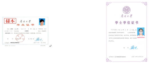 注:两个层次的毕业证书落款均盖南开大学印章及校长印章,照片由天津市教委加盖天津市成人高等教育证书专用章钢印。
